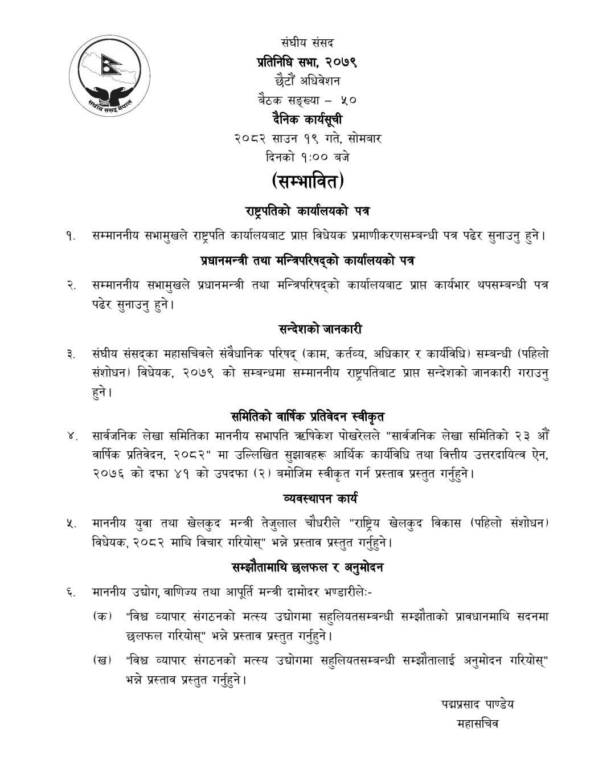 काठमाडौँ, १९ साउन । सङ्घीय संसद् प्रतिनिधिसभाको बैठक आज अपराह्न १ः०० बजे सङ्घीय संसद् भवन नयाँ बानेश्वरमा बस्दैछ ।