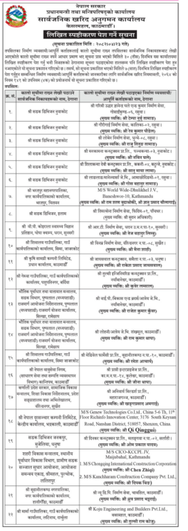 प्रधानमन्त्री तथा मन्त्रिपरिषद कार्यालय मातहतको सार्वजनिक खरिद अनुगमन कार्यालयले सुरुमा ३० दिनको म्याद दिएर स्पष्टीकरण माग्दा पनि नबुझाएका कम्पनीहरुको सूची सार्वजनिक गर्दै ती कम्पनीहरुलाई सात दिनभित्र लिखित स्पष्टीकरण बुझाउन मौका दिएको हो ।