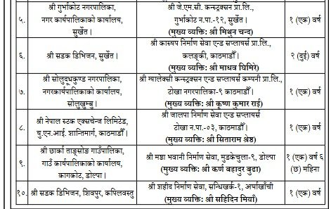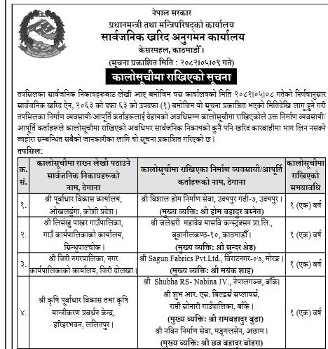 काठमाडौँ, ९ भदौ । सार्वजनिक खरिद अनुगमन कार्यालयले १० निर्माण कम्पनीलाई कालोसूचीमा राख्ने निर्णय गरेको छ । कार्यालयले ती निर्माण कम्पनीलाई आइतबार कालोसूचीमा राख्ने निर्णय गरेर सोमबार सार्वजनिक सूचना प्रकाशित गरेको हो ।