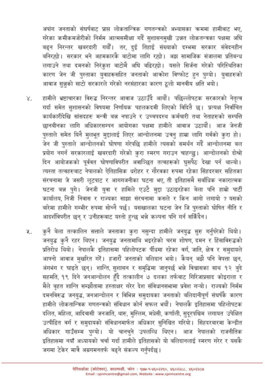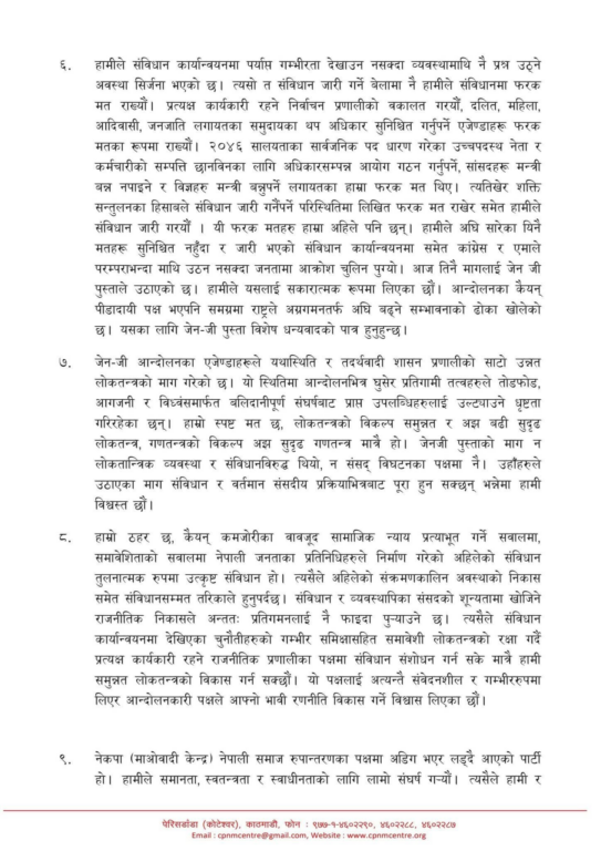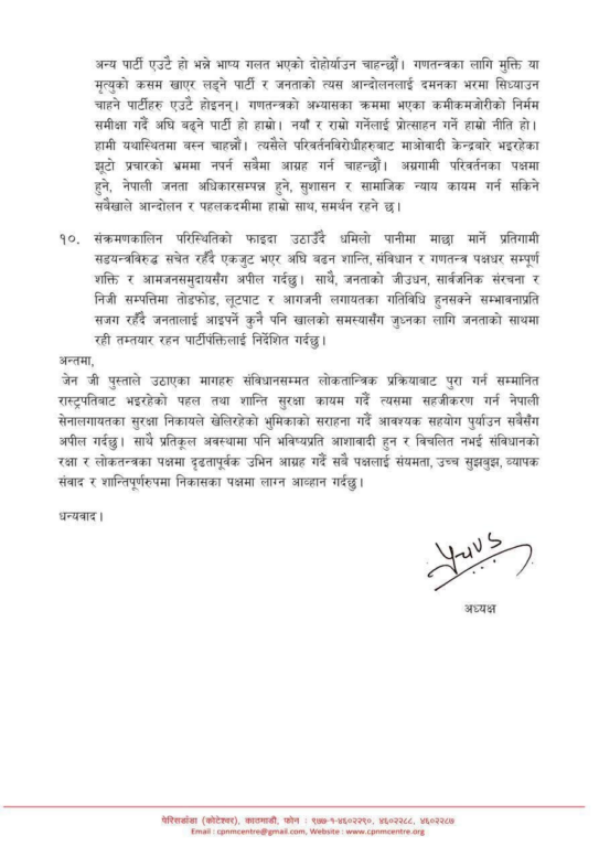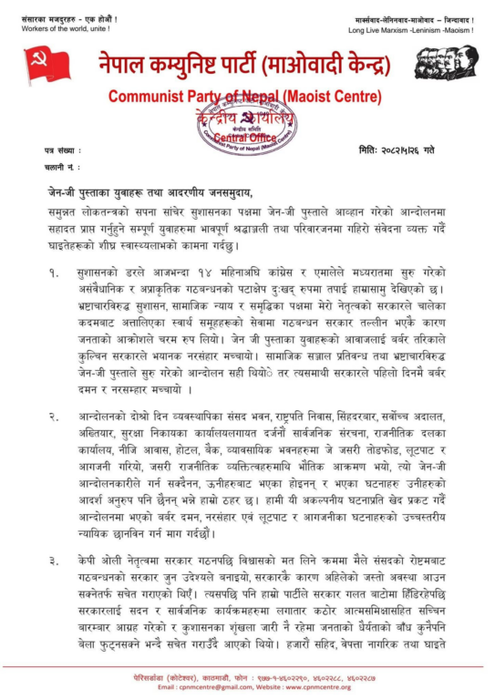 काठमाडौँ, २६ भदौ । नेकपा माओवादी केन्द्रका अध्यक्ष पुष्पकमल दाहाल प्रचण्डले आफ्नो १० बुँदे धारणा सार्वजनिक गरेका छन् ।