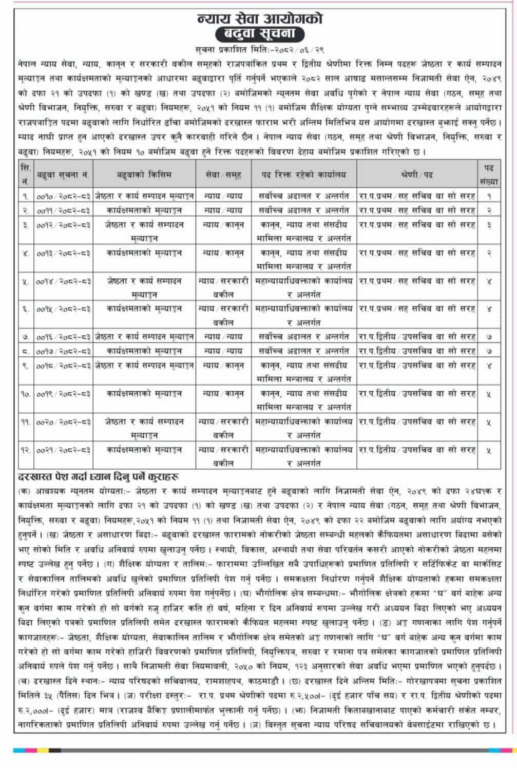 काठमाडौँ, २९ असोज । न्याय सेवा आयोगले नेपाल न्याय सेवा अन्तर्गत न्याय, कानुन र सरकारी वकिल समूहको राजपत्राङ्कित प्रथम र द्वितीय श्रेणीका रिक्त पदहरू बढुवाद्वारा पूर्ति गर्न सूचना प्रकाशित गरेको छ।