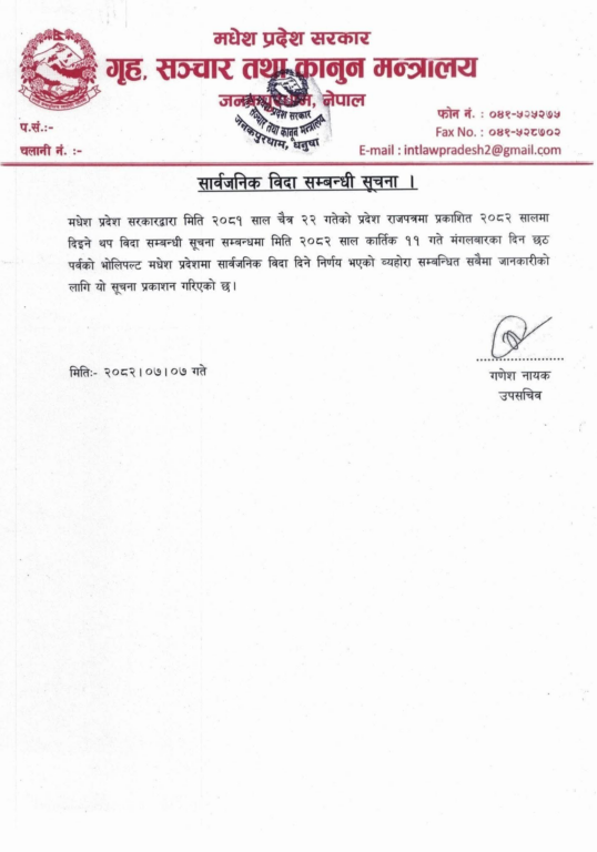 प्रदेश सरकारको गृह, सञ्चार तथा कानुन मन्त्रालयले आज (शुक्रबार) विज्ञप्ति जारी गर्दै छठको उदाउँदो सूर्यको दिन अर्थात् कार्तिक ११ गते मंगलबार पनि सार्वजनिक बिदा दिने जानकारी दिएको छ ।