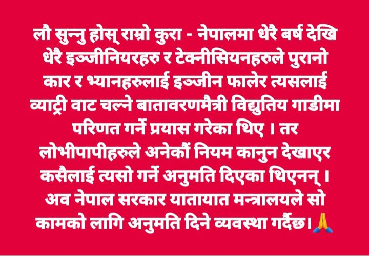 नेपालमा धेरै वर्षदेखि धेरै इन्जिनियरहरू र टेक्निसियनहरूले पुरानो कार र भ्यानहरूलाई इन्जिन फालेर त्यसलाई ब्याट्रीबाट चल्ने वातावरणमैत्री विद्युतीय गाडीमा परिणत गर्ने प्रयास गरे पनि सरकारले अनुमति नदिएको पुनले उल्लेख गरेका छन् ।