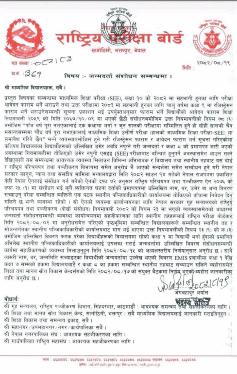 बोर्डका सदस्य सचिव जंगबहादुर अर्यालले जन्ममितिमा संशोधन गर्न सकिने प्रावधान रहेकाले उमेर नपुगेको भए त्यसलाई संशोधन गरेर परीक्षा आवेदन फाराम भर्न सकिने सर्कुलरमा जनाएका छन् । बोर्डले २०८२ को एसईईमा सहभागी हुने विद्यार्थीको परीक्षा आवेदन फाराम र २०८३ को परीक्षाको सहभागी हुन कक्षा ९ मा रजिस्ट्रेसन फाराम दर्ताको काम गरिरहेको छ ।