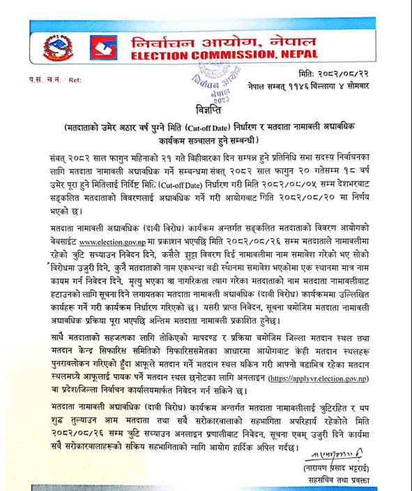 काठमाडौँ, २२ मंसिर । निर्वाचन आयोगले मतदाता नामावलीमा त्रुटि भए सच्याउन मंसिर २६ गतेसम्म निवेदन दिन आग्रह गरेको छ ।