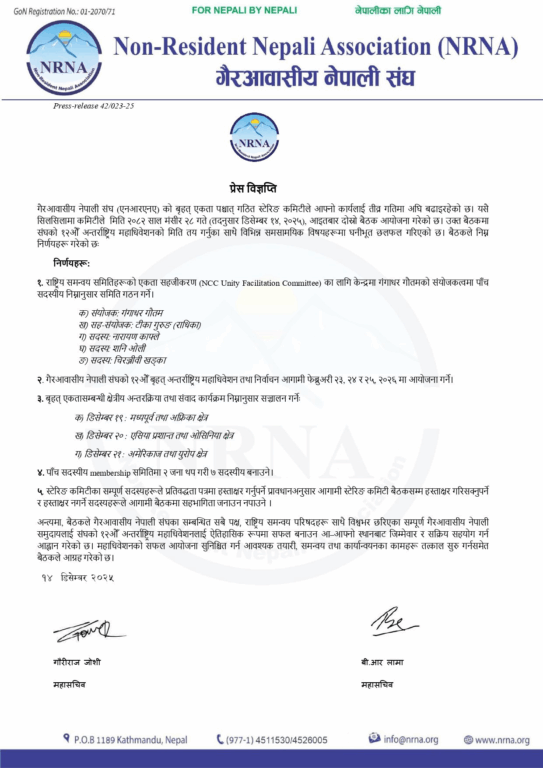 काठमाडौँ, २९ मंसिर । हालै दुई समूहबिच एकीकरण भएको गैरआवासीय नेपाली संघ (एनआरएनए)ले आफ्नो १२औँ अन्तर्राष्ट्रिय महाधिवेशनको मिति र स्थान औपचारिक रूपमा तय गरेको छ ।