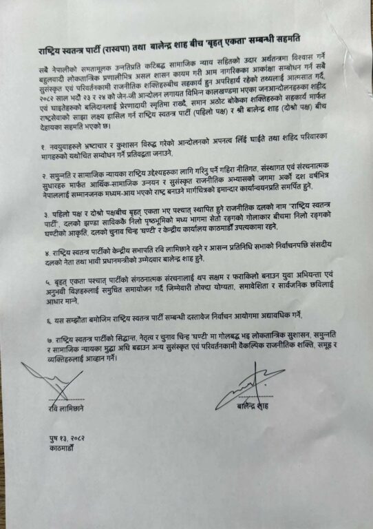काठमाडौँ, १३ पौष । राष्ट्रिय स्वतन्त्र पार्टी (रास्वपा) सभापति रवि लामिछाने र काठमाडौँ महानगरपालिकाका प्रमुख बालेन्द्र शाहबिच आज बिहान ‘बृहत् एकता’मा सहमति जुटेको छ । सहमति पत्रमा दुवै नेताले हस्ताक्षर गरेका छन् ।