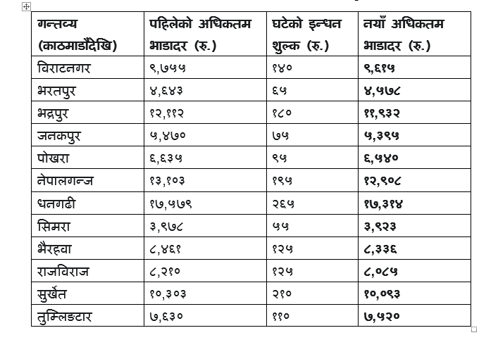 नयाँ भाडा दर अनुसार काठमाडौँबाट हुने उडानमा सबैभन्दा धेरै धनगढी रुटमा २६५ रुपैयाँले शुल्क घटेको छ भने सबैभन्दा कम सिमरा रुटमा ५५ रुपैयाँले घटेको छ । काठमाडौँबाट उडान भर्ने रुटमा देहाय बमोजिमको सरचार्ज शुल्क घटेको छ ।