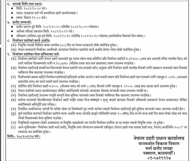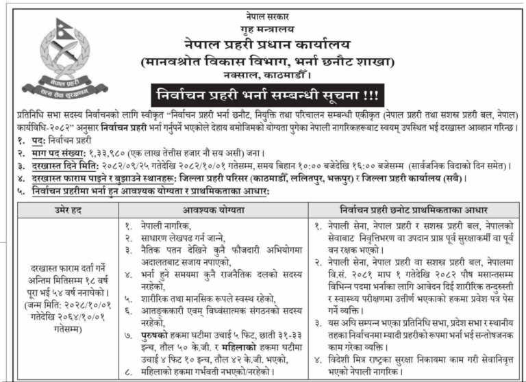 प्रहरी प्रधान कार्यालय, मानवस्रोत विकास विभाग, भर्ना छनोट शाखाले सूचना जारी गर्दै एक लाख ३३ हजार ९८० ज ना निर्वाचन प्रहरी माग गरेको छ ।