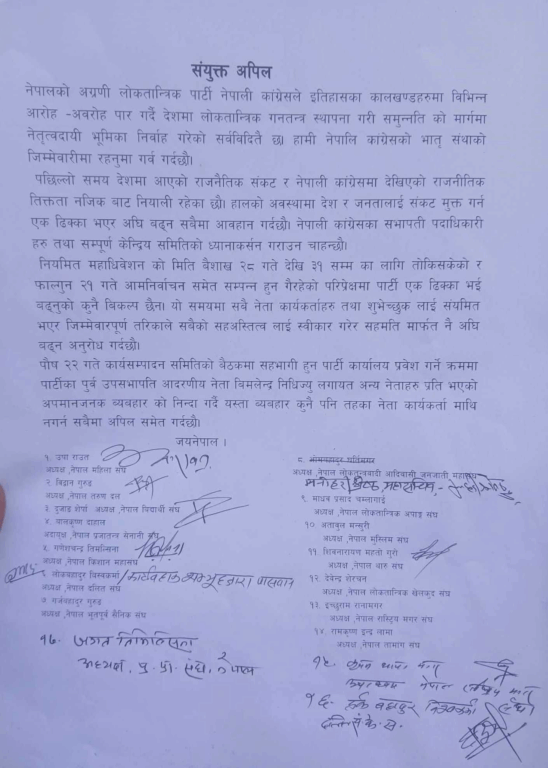 शुक्रबार संयुक्त अपिल जारी गर्दै नेपाल महिला संघकी अध्यक्ष उषा राउत, तरुण दलका अध्यक्ष विद्वान गुरुङ, नेपाल विद्यार्थी सङ्घका अध्यक्ष दुजाङ शेर्पा, नेपाल प्रजातन्त्र सेनानी सङ्घका अध्यक्ष बालकृष्ण दाहाल, नेपाल किसान महासङ्घका अध्यक्ष गणेशचन्द्र तिमल्सिना, नेपाल दलित सङ्घका कार्यवाहक अध्यक्ष शम्भु हजारा पासवान, नेपाल भूतपूर्व सैनिक सङ्घका अध्यक्ष गर्जबहादुर गुरुङ, प्रजातान्त्रिक प्राध्यापक सङ्घका अध्यक्ष जगत तिमिल्सिना, नेपाल लोकतन्त्रवादी आदिवासी जनजाति महासङ्घका अध्यक्ष ओमबहादुर घर्तीमगर, नेपाल लोकतान्त्रिक अपाङ्ग सङ्घका महासचिव मनोहरि श्रेष्ठ, नेपाल मुस्लिम सङ्घका अध्यक्ष अतावुल मन्सुरीले अपिल जारी गरेर पार्टीलाई एकताबद्ध बनाउन आग्रह गरेका हुन् ।