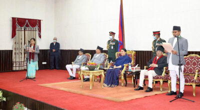 काठमाडौँ, २४ माघ ।राष्ट्रिय सभाका नवनिर्वाचित उपाध्यक्ष उर्मिला अर्यालले पद तथा गोपनीयताको शपथ लिएकी छन् । उपाध्यक्ष अर्यालले शीलत निवासमा राष्ट्रपति विद्यादेवी भण्डारीको उपस्थितिमा राष्ट्रिय सभा अध्यक्ष गणेशप्रसाद तिमिल्सिनाबाट शपथ लिएकी हुन् । माओवादीबाट राष्ट्रिय सभा सदस्य रहेकी अर्याल सोमबार निर्विरोध रुपमा उपाध्यक्षमा निर्वाचित भएकी थिइन् ।