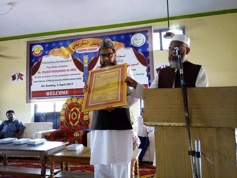 नेपालका लागि कतारी राजदुत युशुफ मोहम्मद अल(हिल को स्वागत सम्मानमा जामिया सिराजुल उलुम अस(सलाफिया मुस्लिम कालेज झण्डानगरले आयोजना गरेको कार्यक्रममा कालेजका प्रोफेसर डास्अब्दुल गनी अल कुफीले १२० बर्ष पुरानो ईतिहास रहेको अल्पसंख्यक समाजको यस कालेजलाई विश्वविद्यालय समकक्ष पुर्याउन सबै सरोकारवालासंग अनुरोधगरेका छन ।