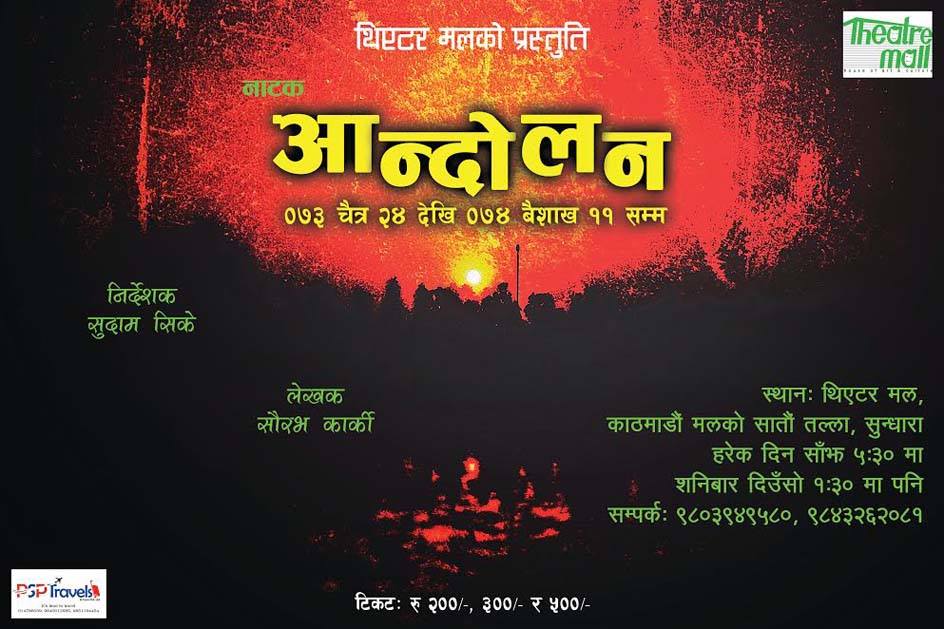 २०४६ तथा २०६२–६३ को जनआन्दोलन सुरुवात भएको विशेष र ऐतिहासिक दिन चैत २४ बाटै त्यस्तै झल्को दिने नाटक ‘आन्दोलन’को मञ्चन सुरु हुन लागेको हो । यस नाटक सौरभ कार्कीले लेखेका हुन् भने प्रतिवद्ध युवा रंगकर्मी सुदाम सिकेले निर्देशन गरेका हुन् ।