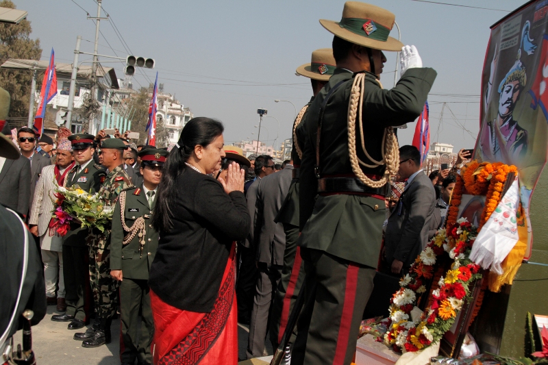 राष्ट्रपति विद्यादेवी भण्डारी र प्रधानमन्त्री शेरबहादुर देउवाले राष्ट्रनिर्माता पृथ्वीनारायण शाहको शालिकमा माल्यार्पण गरेका छन् । २९६ औँ पृथ्वी जयन्ती तथा राष्ट्रिय एकता दिवसका अवसरमा बिहीबार सिंहदरबारको पश्चिम गेटअगाडि रहेको शाहको शालिकमा भण्डारी र देउवाले माल्यार्पण गरेका हुन् ।