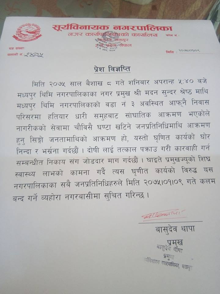 मेयर श्रेष्ठमाथि आक्मण गर्ने समूहलाई तत्काल पक्ताउ गरी कारवाही गर्न सूर्यविनायक नगरपालिकाले सम्बन्धीत निकायसंग माग गरेको छ ।