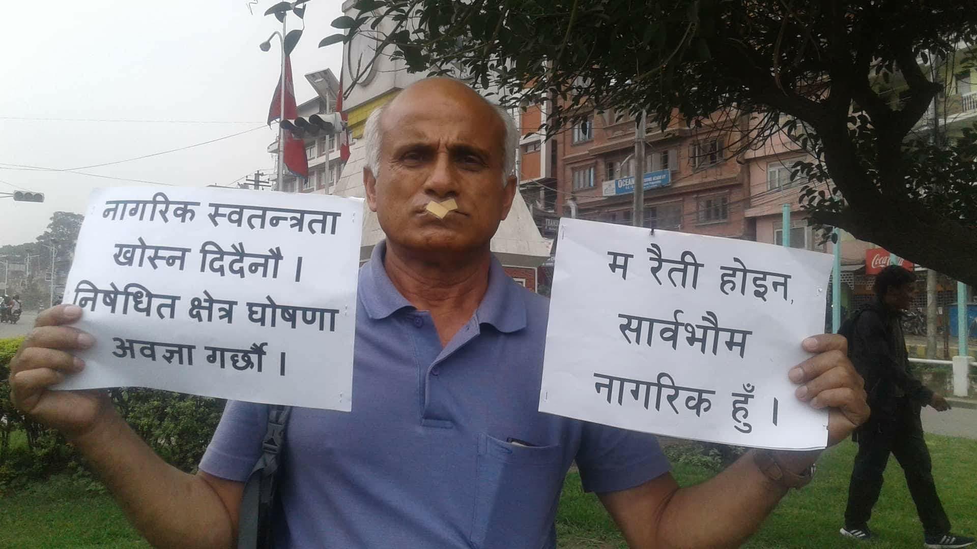 करिव दुई महिना अघि सरकारले निषेधित क्षेत्र घोषणा गरेको विरुद्धमा डा. केसीले आन्दोलन गरेका हुन । नागरिकको स्वतन्त्रता कुण्ढीत गरेको भन्दै उनले प्लेकार्डको माध्यमबाट आन्दोलन गरेका हुन् । उनले आफ्नो प्लेकार्डमा देखाएका छन् ‘नागरिक स्वतन्त्रता खोस्न दिदैनौं, निषेधित क्षेत्र घोषणा अवज्ञा गर्छौ, म रैति हैन नागरिक हुँ भन्ने जस्ता प्लेकार्ड बोकी आफ्नो मुखमा टेप टाली मौन आन्दोलन गरेका छन् ।
