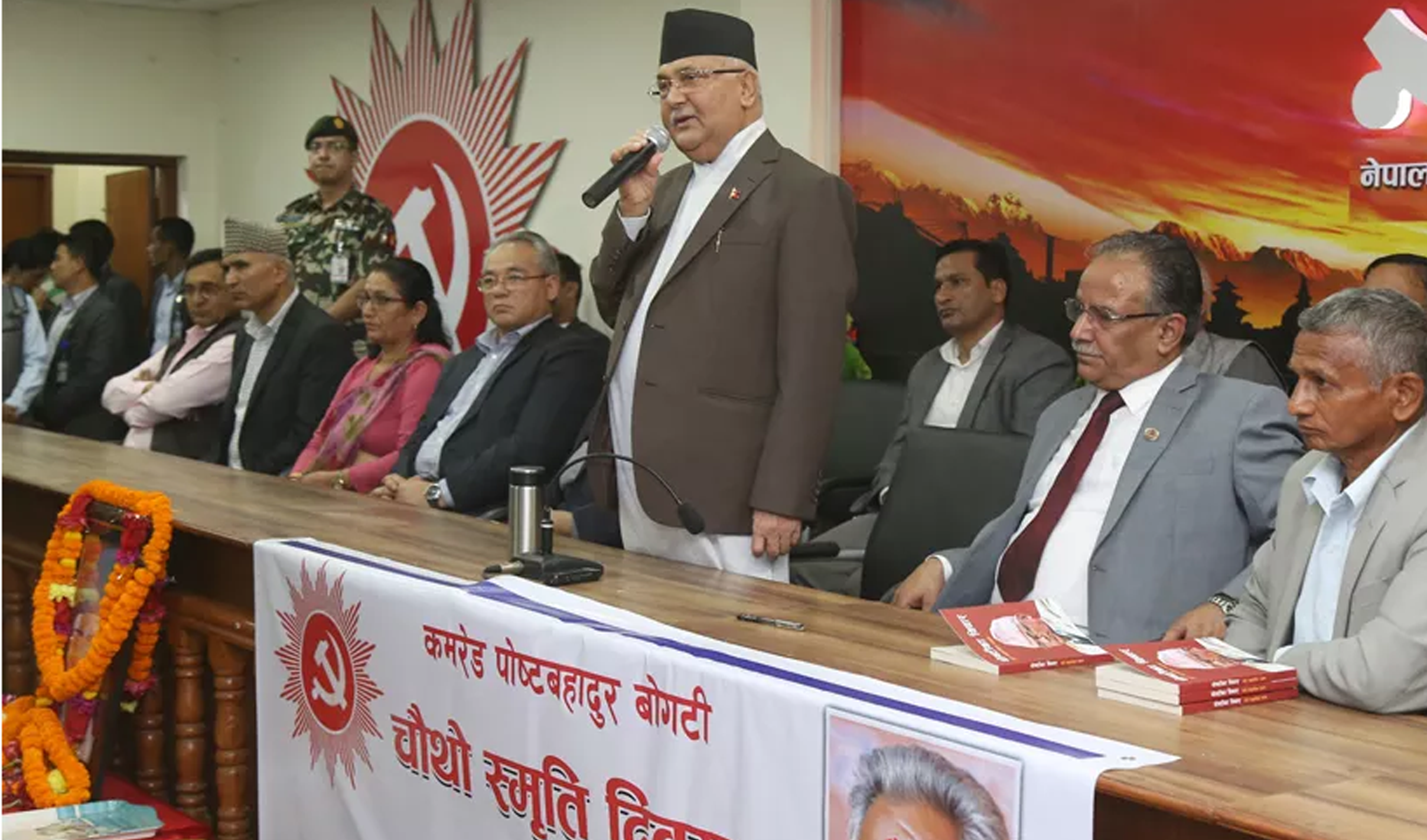 शनिबार पार्टी मुख्यालय धुम्बाराहीमा बोगटीको चौथोँ स्मृति दिवसका अवसरमा प्रधानमन्त्री ओलीले अहिले पार्टीमा अन्तरविरोध खडा गर्ने, भाँजो हाल्ने प्रयास भइरहेको भन्दै त्यसलाई परास्त गरी पार्टी एकतालाई सुदृढ गराएर छाड्ने बताएका हुन्।