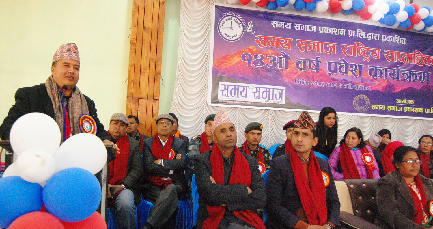 भक्तपुरबाट प्रकाशित हुने समय समाज प्रकाशन प्रालिद्वारा सञ्चालित समय समाज साप्ताहिकको आज आयोजित १४ औँ वर्ष प्रवेश कार्यक्रममा सांसद बस्नेतले आस्था र विश्वास फरक रहेता पनि पत्रकारीताको अभियानमा राजनीीतक दल, विभिन्न संघसंस्था तथा पत्रकारसँग सँगै हुनुपर्नेमा जोड दिनुभएको छ ।