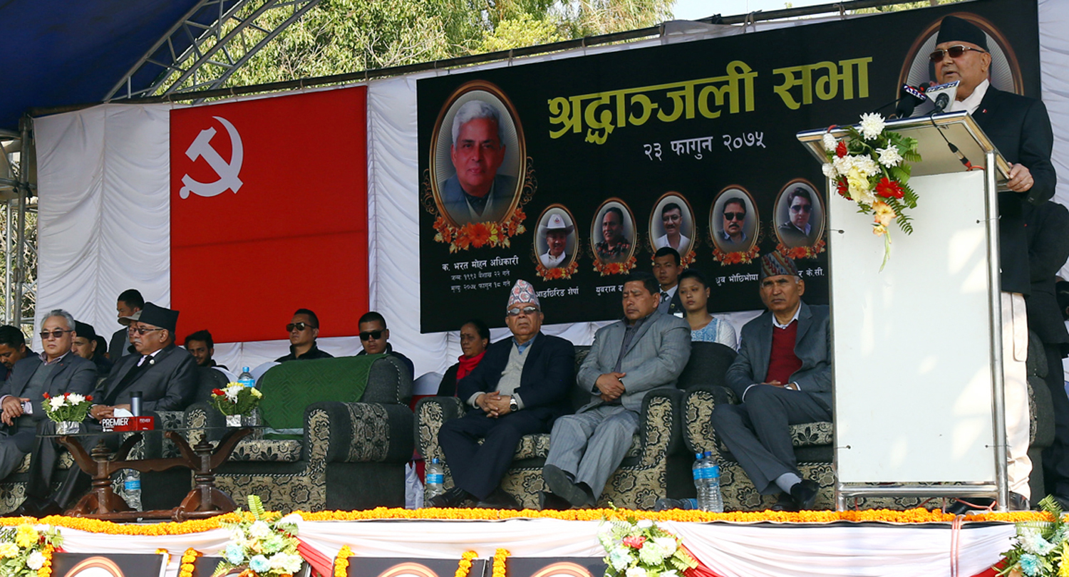नेकपाले आयोजना गरेको दिवंगत पूर्वउपप्रधानमन्त्री भरतमोहन अधिकारी र पर्यटनमन्त्री रवीन्द्र अधिकारी लगायत हेलिकप्टर दुघृटनामा परि मृत्यु भएकाको सम्झनामा बिहीबार काठमाडौंमा आयोजित श्रदाञ्जली सभामा बोल्दै प्रधानमन्त्री ओलीले सरकारले कामै गरेन भनेर जसरी प्रचार गरिएको थियो त्यसलाई चिर्न मन्त्री बनेको एक वर्षको अवधिमा अधिकारीले असाधारण योगदान दिनुभएको भन्दै प्रधानमन्त्री ओलीले प्रशंसा पनि गर्नुभयो ।