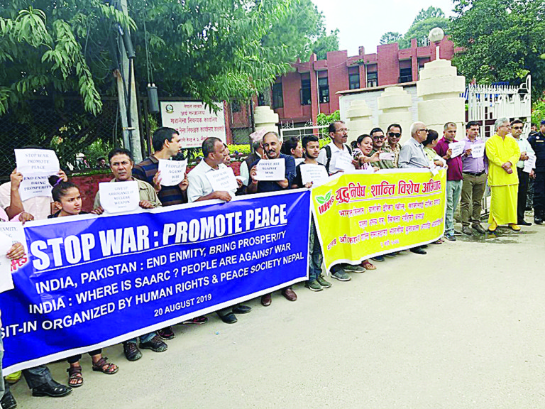 हिंसात्मक गतिविधिलाई प्रोत्साहन नगर्न, वार्ता र संवादमार्फत सो क्षेत्रमा शान्ति र स्थायित्व कायम गर्नरगराउन मानव अधिकार तथा शान्ति समाजले काठमाडौंस्थित भारतीय र पाकिस्तानी दूतावासअगाडि धर्ना दिएको छ। जम्मुकस्मिरको विषयका कारण दक्षिण एसियाली क्षेत्रीय सहयोग संगठन (सार्क) निस्क्रिय हुन नहुने भन्दै समाजले दुवै मुलुकको ध्यानाकर्षण गराएको हो।
