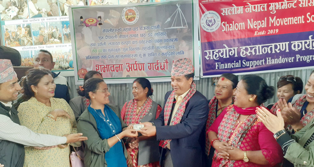 भक्तपुरलाई सडक मानवमुक्त बनाउने मुख्य उद्देश्यका साथ चाँगुनारायण नगरपालिकामा सञ्चालनमा रहेको उक्त सेवा घरलाई सांसद बस्नेतले आफ्नो तर्फबाट दशैं खर्च स्वरुप दश हजार, इजरायलमा बसोवार गर्ने नेपालीहरुको संस्था सलोन नेपाल मुभमेन्ट सोसाइटीद्वारा उक्त सेवा घरलाई रु १ लाख ३५ हजार तथाअ नेकपाकी नेतृ तथा अखिल नेपाल महिला संघ भक्तपुर क्षेत्र नंं. २ की अध्यक्ष हिरामाया शेर्पाले आवश्यकय लत्ताकपडासहितको सहयोग संस्थाकी संचालन सुमित्रा चौलागाईलाई हस्तान्तरण गर्नुभएको छ ।