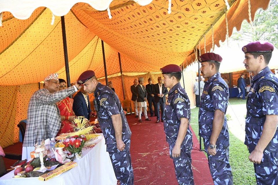 काठमाडौँ, २३ असोज । प्रहरी महानिरीक्षक सर्वेन्द्र खनालले प्रहरी प्रधान कार्यालयस्थित प्रहरी महानिरीक्षकको निवासमा उपस्थित वरिष्ठ प्रहरी अधिकृतहरु, प्रहरी अधिकृत तथा जवानहरु, पूर्व प्रहरी कर्मचारीहरु एवम् प्रहरी परिवारलाई विजया दशमी २०७६ का अवसरमा बुधबार टीका लगाइदिनुभएको छ ।
