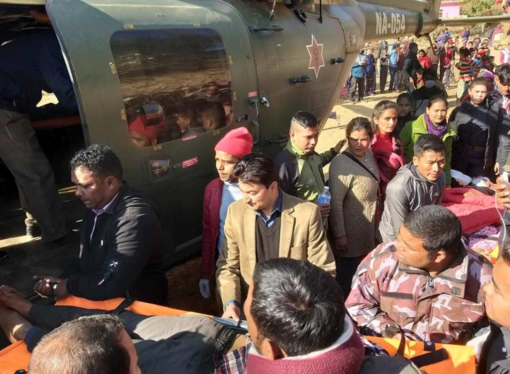 काठमाडौं, मंसिर १७ । नेपाल कम्युनष्टि पार्टी नेकपा का नेता एवं निवर्तमान श्रममन्त्री गोकर्ण विष्ट हेलिकोप्टरसहित बागलुङ पुगेर जिप दुर्घटनाका घाइतेको उद्दार गर्नुभएको छ । नेकपाका नेता बिष्ट आफै दुर्घटनास्थलमा हेलिकोप्टर लिएरुपुगी घाइतेको उद्दार गर्नुभएको हो ।