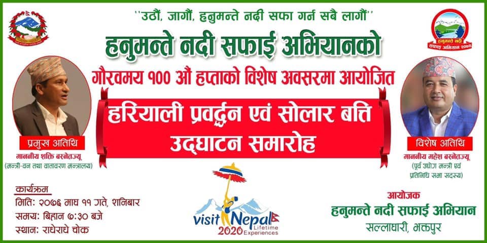 हनुमन्ते नदी सफाई अभियानको आयोजनमा आगामी शनिवार विहान ७ः३० बजे राधेराधे चोकमा अभियानको गौरवमय १००औं हप्ताको अवसरमा नेपाल सरकारका वन तथा वातावरण मन्त्री शक्ति बहादुर बस्नेतको प्रमुख र पूर्बमन्त्री प्रतिनिधि सभा सदस्य महेश बस्नेतको विशेष उपस्थितिमा हरियाली प्रवर्द्वन एवम् सोलार बत्ती उद्घाटन हुने भएको छ ।