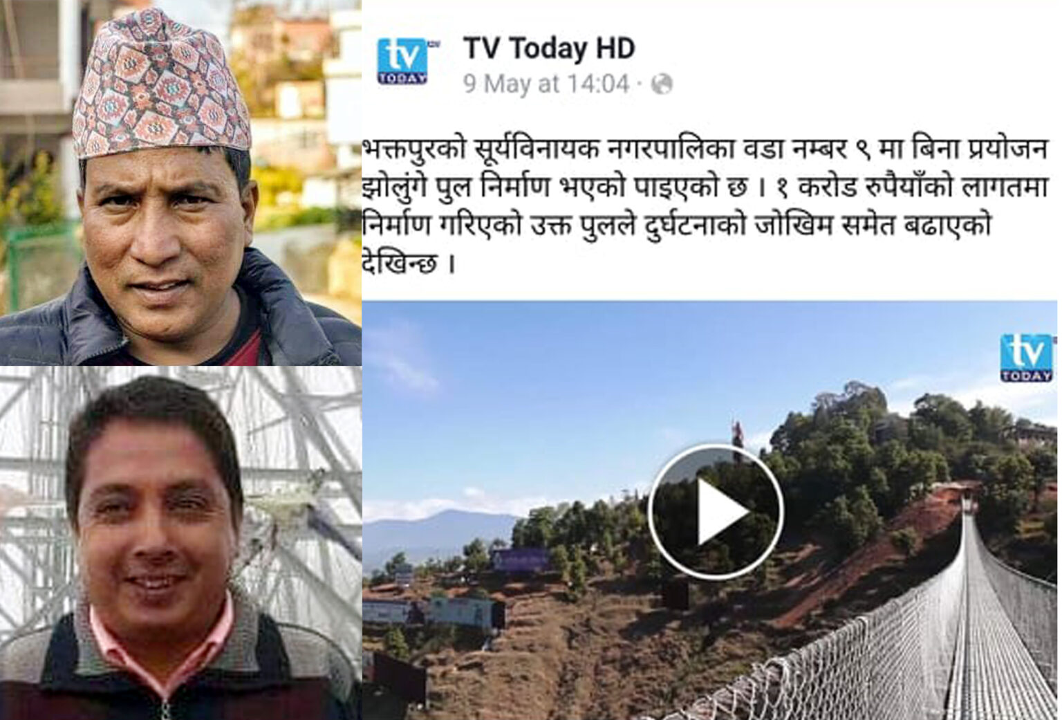 पत्रकारको धर्मको रुपमा रहेको हुन्छ कि सत्य र तथ्यलाई जस्ताको तस्तै जनताको माझ पुर्याउनु पर्छ । नेपालको संविधानको धारा २७ अनुसार आम नेपाली नागरिकले पाउने सूचना तथा जानकारीको प्रभावकारी भूमिका निर्वाह गर्ने सवैभन्दा महत्वपूर्ण जिम्मेवारी सञ्चार माध्यममा रहेको हुन्छ । राम्रोलाई राम्रो र नराम्रोलाई नराम्रो भन्नु नै सच्चा पत्रकारीता हो । जनतालाई सूचनाबाट सूचीत गराउने महत्वपूर्ण जिम्मेवारी रहेको सञ्चाल जगतले नै केही स्वार्थका कारण राम्रोलाई नराम्रो र नराम्रोलाई राम्रो बनाउन उघर रहेको प्रमाणहरु प्रसस्त नै रहेका छन् । यसकै एउटा उदाहरण हो, सूर्यविनायक नगरपालिकाको वडा नं. ९ र १० को सीमा क्षेत्रमा निर्माण गरिएको उपत्यकाकै सवैभन्दा लामो झोलुङ्गे पुल ।