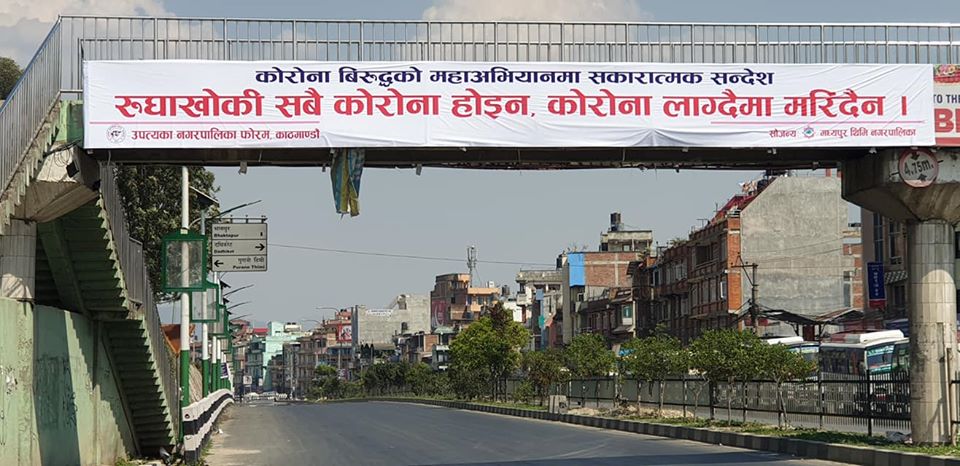 धेरैको नजर आकाशे पुलमा टाँगिएको यो व्यानरमा ठोकिन्छ तर यसको अर्थ कतिले बुझे होलान् वा कतिले वास्तै गरेनन् । कोरोनादेखि आत्तिनु हुदैन भन्ने सन्देश प्रवाह गर्न यस्ता प्रचनर सामाग्री राखेको बताउदै मध्यपुरथिमि नगरपालिकाका प्रमुख मदनसुन्दर श्रेष्ठ भन्नुहुन्छ, “रुघाखोकी लाग्दैमा धेरै मानिसहरु आत्तिने गरेका छन्, कोरोना पो भयो कि भनेर अस्पताल धाउने गरेको पाइन्छ । सामान्य कुरामा पनि यसरी अस्पताल धाउँदा रुघाखोकी लागेको मानिसलाई पनि सङ्क्रमण हुने जोखिम बढ्छ, त्यसैले यसप्रकारको सूचना प्रवाह गरेका हौ ।”