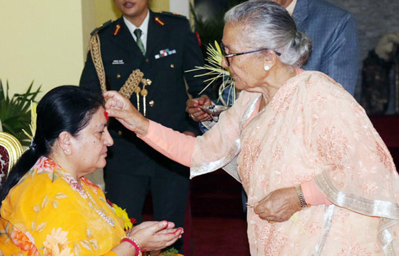 सो अवसरमा राष्ट्रपति भण्डारीले छोरीज्वाइँहरु उषाकिरण, निशाकुसुम, उमेश थापा र अभिषेक यादव तथा दुई नातिनी एवं पाश्र्ववर्तीहरुलाई पनि टीका लगाइदिनुभएको छ ।