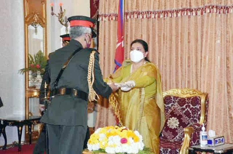 काठमाडौँ, २० कार्तिक । राष्ट्रपति विद्यादेवी भण्डारीले भारतीय सेनाध्यक्ष मनोज मुकुन्द नरवणेलाई नेपाली सेनाको मानार्थ महारथीको उपाधि प्रदान गर्नुभएको छ ।