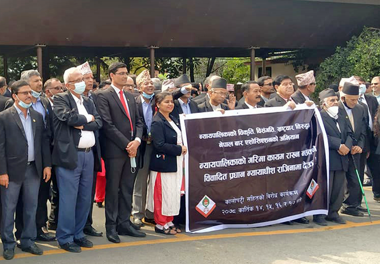 काठमाडौँ, २६ कार्तिक । प्रधानन्यायाधीश चोलन्द्रशमशेर जबराको राजीनामा माग गर्दै नेपाल बार एसोसिएसनको अगुवाइमा आन्दोलनमा उत्रिएका कानुन व्यवसायीले बिहीबार पनि सर्वोच्च अदालत परिसरभित्रै अराजक हिसाबले नाराजुलुस गरे। न्यायपालिकाको इतिहासमा सर्वोच्च अदालत परिसरभित्रै प्रधानन्यायाधीशविरुद्ध अराजक ढंगले नाराजुलुस भएको सायदै पहिलो पटक हो। नेपाल बारका पूर्वपदाधिकारी,वर्तमान पदाधिकारी,वरिष्ठ अधिवक्ताहरू सम्मिलित विरोध कार्यक्रममा उत्तेजित नारा लगाइएका थिए। कानुनका ज्ञाताहरू नै सर्वोच्च अदालत परिसरमा संयमित बन्न सकेनन्।