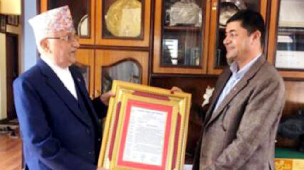 नेपाल कम्युनिष्ट पार्टी ९एमाले०लाई देशको सबैभन्दा ठूलो पार्टी बनाएर इतिहास जोगाएकोमा उहाँलाई अभिनन्दन गरिएको हो । उहाँलाई प्रदान गरिएको सम्मान पत्रमा लेखिएको छ, ‘तपाईंको प्रधानमन्त्रीकालमा मुलुकले राष्ट्रियताको सम्बर्धन र नेपाली जनताको जीवनस्तर विकासको लागि गर्नुभएको काम प्रशंसनीय र अतुलनीय छ ।नेपाल कम्युनिष्ट पार्टी (एमाले)लाई देशको सबैभन्दा ठूलो पार्टी बनाउन सफल हुनुभएकोमा यहाँलाई हार्दिक बधाई व्यक्त गर्दछौँ ।’