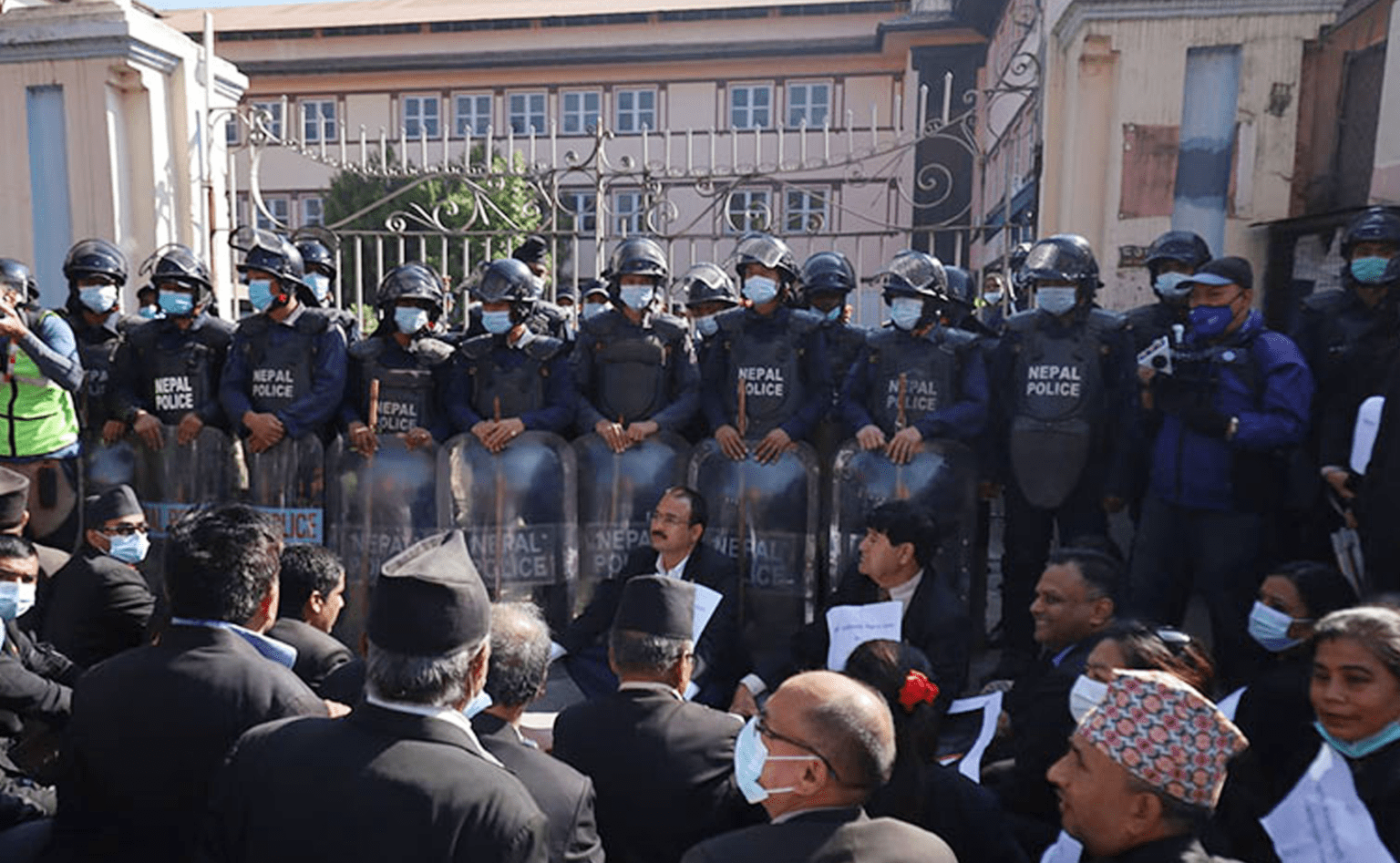 काठमाडौँ, ३ मंसिर । सर्वोच्च अदालतमा बिहीबार वरिष्ठ अधिवक्ता सविता भण्डारी बरालले बिरलै हुने दृश्य देखिन्। प्रहरीको दमन भोगिन्। कतिपयले त युद्धमा प्रयोग गरिने एसएलआर नै बोकेका थिए। झट्ट हेर्दा ब्यारेकजस्तो देखिन्थ्यो न्यायको मन्दिर। न्यायालय शुद्धीकरणको अभियानअन्तर्गत धर्नारत अन्य कानुन व्यवसायीभन्दा अगाडि थिइन् बराल। त्यही बेला महिला प्रहरी आएर लछारपछार गरेको उनले सुनाइन्। ‘हातले धकेलेजस्तो देखाउने तर तलबाट बुटले हिर्काउने रहेछन्’, उनले भनिन्, ‘हातमा पनि सामान्य चोट लागेको छ।’