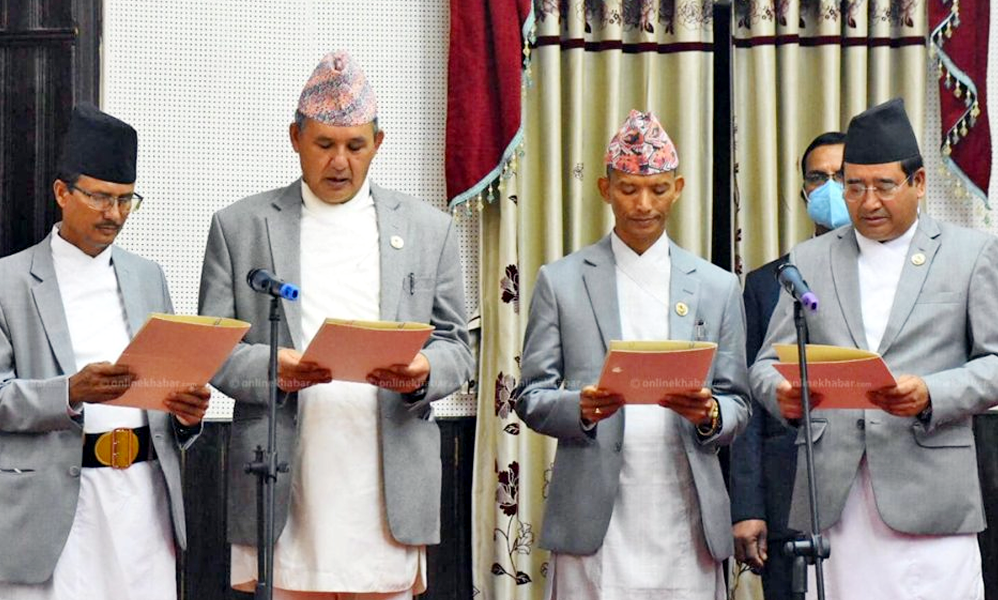 राष्ट्रपति विद्यादेवी भण्डारीले शीतल निवासमा आयोजित समारोहमा नवनियुक्त जीवनराम श्रेष्ठ संस्कृति पर्यटन तथा नागरिक उड्डयनमन्त्री, मेटमणि चौधरी सहरी विकास मन्त्री, शेरबहादुर कुँवर श्रम, रोजगार तथा सामाजिक सुरक्षामन्त्री, भवानी खापुङ स्वास्थ्य तथा जनसंख्या मन्त्री र हीरा केसी स्वास्थ्य तथा जनसंख्या राज्यमन्त्रीले शपथ लिएका हुन् ।