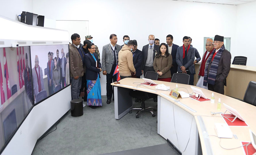 आज प्रधानमन्त्रीले उक्त भवनमा रहेका एक्सन रुम, स्टुडियो, भवनको पाँचौ तलामा निर्माणाधीन हल, मन्त्रालयका अन्य कार्यकक्ष लगायतका संरचनाको निक्षण तथा अवलोकन गरेका हुन् ।