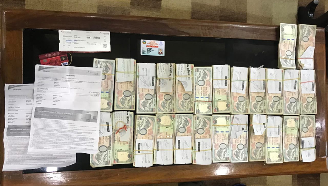 उक्त रकम लिएर सापकोटा श्री एयरलाइन्सको उडानमार्फत नेपालगन्जदेखि काठमाडौं जाँदै थिए । सापकोटालाई थप अनुसन्धानका लागि जिल्ला प्रहरी कार्यालयमा राखिएको छ । रासस