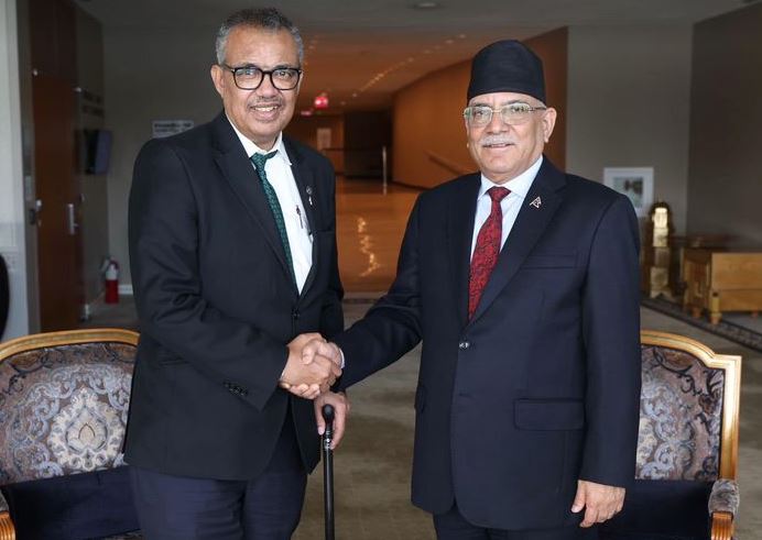 संयुक्त राष्ट्रसंघको ७८ औं महासभाको साइडलाइनमा उनीहरूबीच भेटवार्ता भएको हो । भेटवार्ता अमेरिकाको न्यूयोर्कस्थित संयुक्त राष्ट्रसंघको मुख्यालयमा बिहीबार भएको थियो । “भेटमा नेपाल र विश्व स्वास्थ्य संगठनबीचमा हुँदै आएका आपसी सहयोगका विविध क्षेत्रबारे छलफल हुनुका साथै जनस्वास्थ्यका विभिन्न विषयमा अझ प्रभावकारी सहकार्य गर्ने समझदारी बनेको छ,” प्रधानमन्त्री प्रचण्डले सामाजिक सञ्जाल फेसबुकमा लेखेका छन् ।