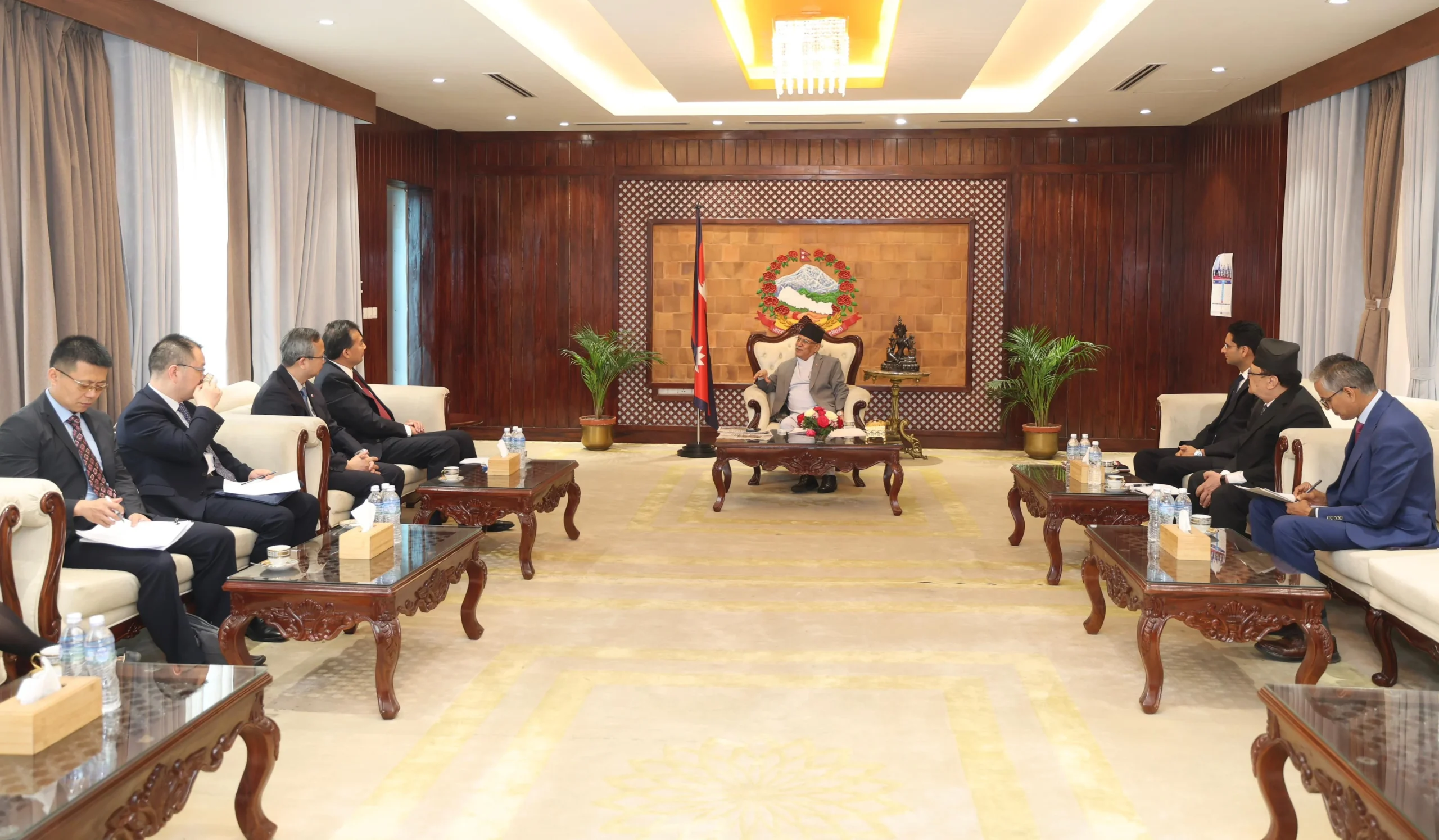 भेटमा प्रधानमन्त्रीका परराष्ट्र सल्लाहकार डा.सापकोटा, चीनका लागि नेपाली राजदूत बिष्णुपुकार श्रेष्ठ, परराष्ट्र मन्त्रालयका अधिकारी एवं नेपालका लागि चिनियाँ राजदूत छेन सङलगायतका अधिकारीहरू उपस्थित थिए ।