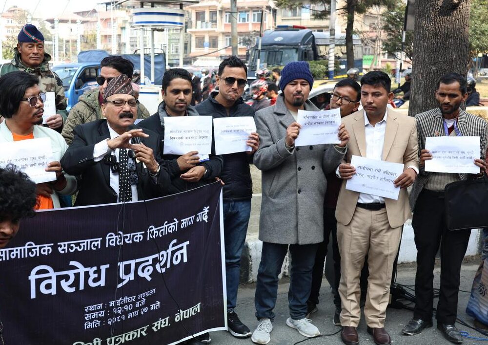 काठमाडौँ, २७ माघ । सरकारले ल्याएको सामाजिक सञ्जाल नियमनसम्बन्धी विधेयक फिर्ताको माग राख्दै अनलाइन टिभी पत्रकार संघले माइतीघर मण्डलामा  विरोध प्रदर्शन गरेको छ ।