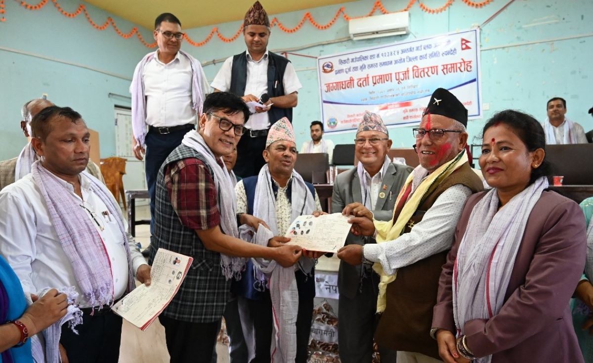 आयोगका अध्यक्ष थापा र जिल्ला समन्वय समिति रुपन्देहीका प्रमुख उमाकान्त चपाईले स्थानीय प्रेम बहादुर दर्जीलाई जग्गाधनी प्रमाण पूर्जा हस्तान्तरण गरेर लालपूर्जा वितरण कार्यको सुरुआत गरेका थिए ।