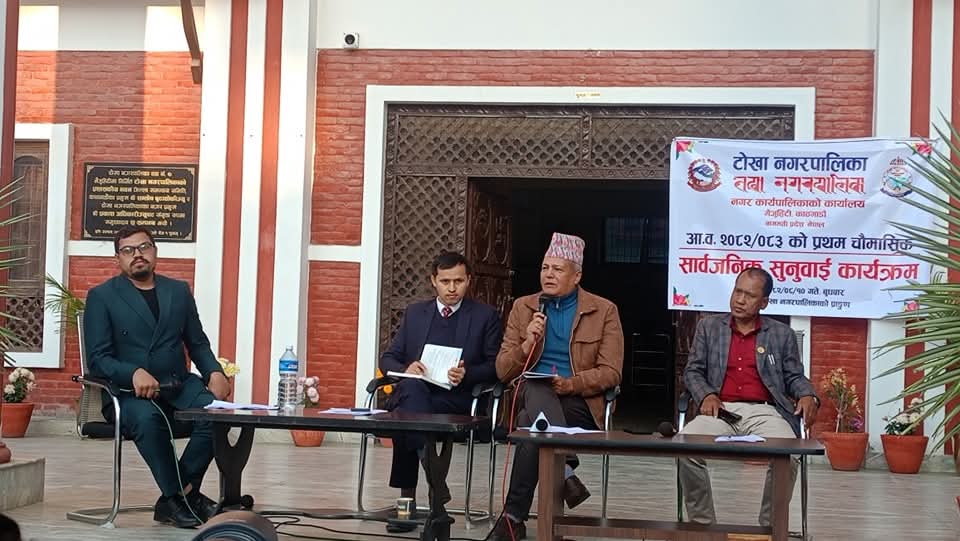 काठमाडौँ, ११ मंसिर । टोखा नगरपालिकाले चालुु आर्थिक वर्ष २०८२÷८३ को पहिलो चौमासिक सार्वजनिक सुनुवाइ कार्यक्रम सम्पन्न गरेको छ । बुधबार नगरपालिकाको प्राङ्गणमा नगर प्रमुख प्रकाश अधिकारीको अध्यक्षतामा सम्पन्न भएको कार्यक्रममा जनप्रतिनिधि, कर्मचारी, स्थानीयवासी तथा विभिन्न क्षेत्रका सरोकारवालाको सक्रिय सहभागिता रहेको थियो । कार्यक्रममा नगरपालिकाले चालु चौमासिकका कामकारबाही, उपलब्धि र आगामी योजनाहरूको स्पष्ट प्रस्तुति राख्दै नागरिकबाट प्राप्त सुझाव र गुनासोहरूलाई आत्मसात गर्ने प्रतिबद्धता जाहेर गरिएको थियो । “कला, संस्कृतियुक्त, स्वच्छ र समुन्नत टोखा नगर” को लक्ष्यसहित अघि बढिरहेको छ ।