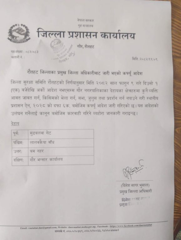 रौतहट, ९ फागुन । रौतहटमा कर्फ्यू आदेश जारी भएको छ ।