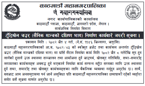 महानगरपालिकाको सार्वजनिक निर्माण विभागले आज एक जरुरी सूचना जारी गर्दै आगामी चैत ८ गतेदेखि निर्माण कार्य सुरु हुने जानकारी दिएको हो ।