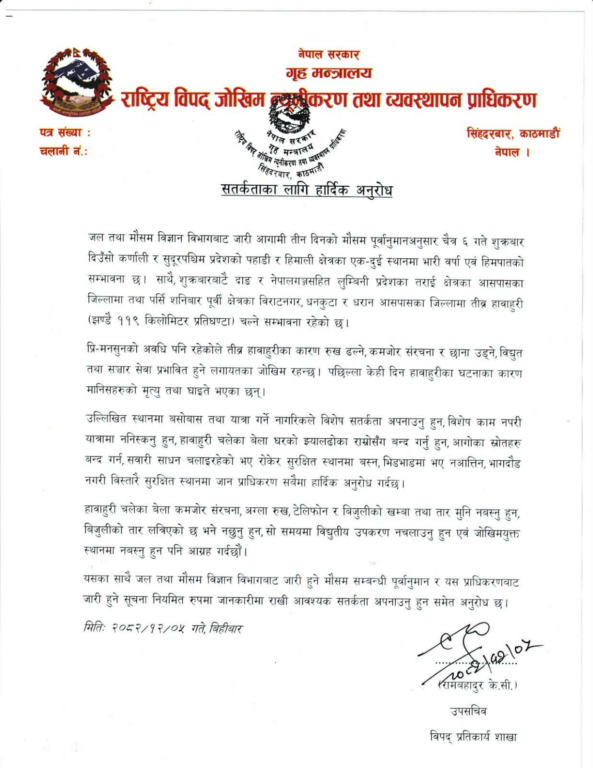 बिहीबार प्राधिकरणले सूचना जारी गर्दै प्रि मनसुनको अवधि पनि रहेकोले सतर्कता अपनाउन आग्रह गरेकाे हाे । उल्लिखित स्थानमा बसोबास तथा यात्रा गर्ने नागरिकले विशेष सतर्कता अपनाउनु हुन, विशेष काम नपरी यात्रामा ननिस्कनु हुन, हावाहुरी चलेका बेला घरको झ्यालढोका राम्रोसँग बन्द गर्नु हुन, आगोका स्रोतहरु बन्द गर्न, सवारी साधन चलाइरहेको भए रोकेर सुरक्षित स्थानमा बस्न, भिडभाडमा भए नआत्तिन, भागदौड नगरी विस्तारै सुरक्षित स्थानमा जान प्राधिकरण सबैमा हार्दिक अनुरोध गरेकाे हाे ।