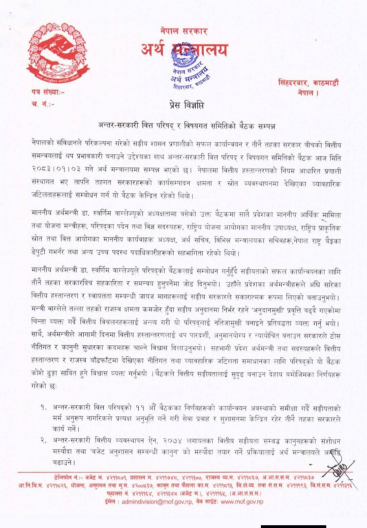 काठमाडौँ, ४ बैशाख । अर्थ मन्त्रालयमा बिहीबार अर्थमन्त्री स्वर्णिम वाग्लेको अध्यक्षतामा बसेको अन्तर सरकारी वित्त परिषद्को बैठकले दोहोरो कर हटाउने निर्णय गरेको छ ।