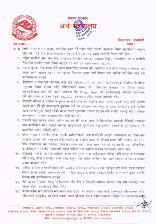 सरकारले राजस्व चुहावट नियन्त्रणका लागि तीनै तहका सरकारबीच समन्वय गर्ने, आन्तरिक स्रोत परिचालनलाई प्राथमिकता दिन प्रत्येक तहले चालू आर्थिक वर्षभित्रै राजस्व संकलन र चुहावट नियन्त्रण कार्ययोजना तयार गर्ने, विद्युत, पर्वतारोहण, वन र खानीको रोयल्टीमा स्थानीय तहको हिस्सा बढाउन नयाँ सूत्र ल्याउनले निर्णय पनि गरेको छ ।