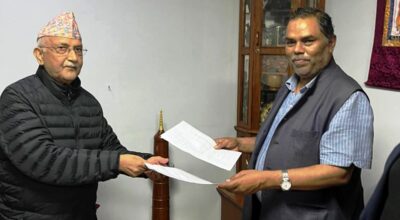 झापा, २३ असोज । नेकपा एमालेका अध्यक्ष केपी शर्मा ओलीले झापा पुगेर प्रतिनिधिसभा सदस्यका लागि मनोनयन दर्ता गराएका छन् । उनी आफैं उपस्थित भएर आज दिउँसो झापा क्षेत्र नं. ५ का लागि मनोनय दर्ता गराएका हुन् । यो क्षेत्रमा नेपाली कांग्रेसले खगेन्द्र पाण्डव अधिकारीलाई उम्मेदवार बनाएको छ ।