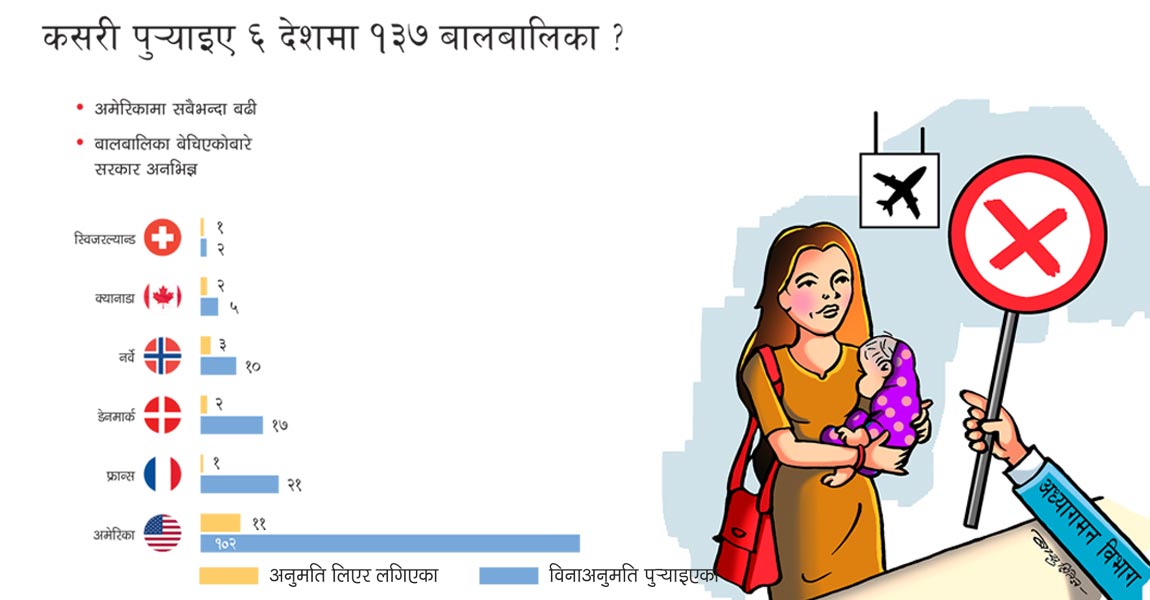 नौ वर्षयता ६ मुलुकमा २० बालबालिका धर्मपुत्र–धर्मपुत्री बनाएर लगिएको सरकारी अभिलेख छ । ती मुलुकका तथ्यांक जोड्दा त्यही अवधिमा १ सय ५९ नेपाली बालबालिका त्यहाँ धर्मसन्तानका रूपमा लगिएका छन् । बढी भएका १ सय ३७ जना कसरी गए ? यसले धर्म सन्तानका नाममा नेपालबाट बालबालिका तस्करी भइरहेको पुष्टि हुन्छ । सरकारले १८ मुलुकमा बालबालिकालाई धर्मपुत्र–धर्मपुत्री…